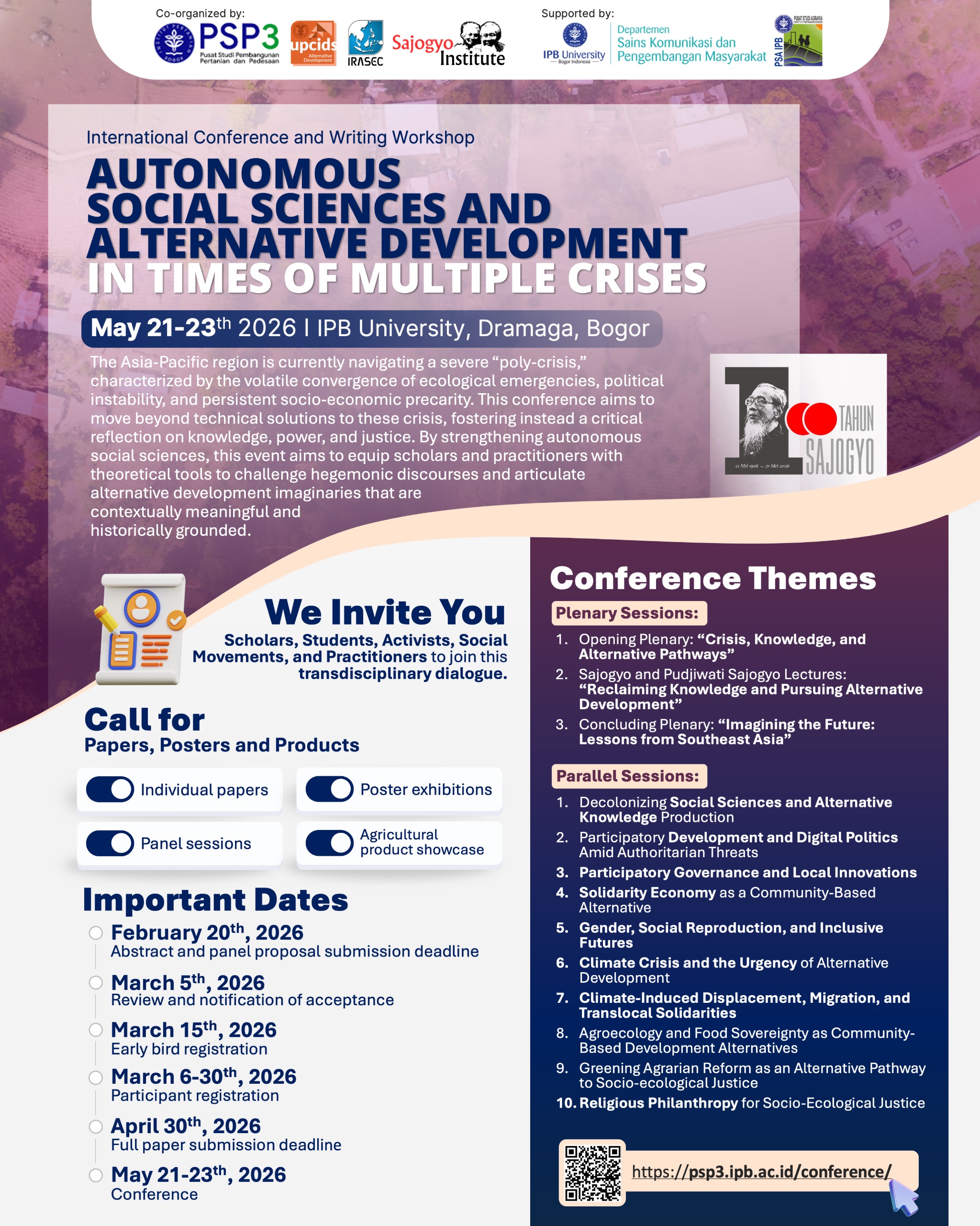 We invite scholars, activists, and practitioners to join this transdisciplinary dialogue. This conference seeks to catalyze collaboration across national boundaries, elevate marginalized knowledges, and generate tangible scholarly outputs that influence both academic infrastructures and policy sectors. Aligned with IPB University’s strategic goal of fostering global research networks, this initiative serves as a platform to assert agency over our collective futures, ensuring that the response to the poly-crisis is defined by pluralism, intellectual sovereignty, and social justice.