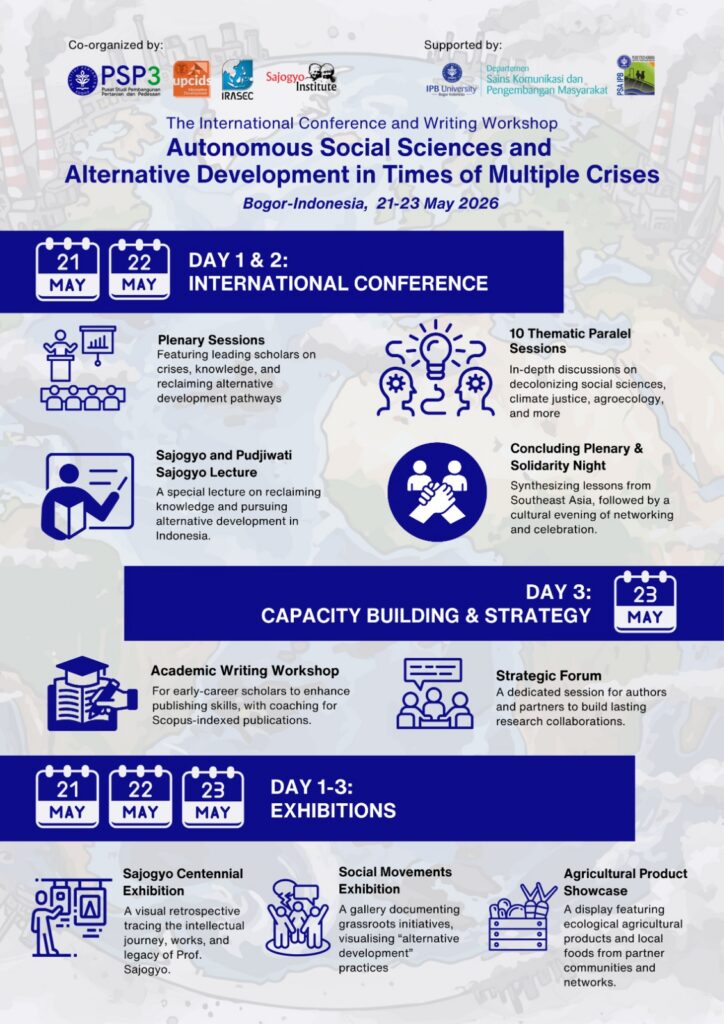 It is within this landscape of urgency and opportunity that PSP3 IPB University, in collaboration with AltDev UP CIDS (Philippines), IRASEC (Thailand), and the Sajogyo Institute (Indonesia), convenes this International Conference and Writing Workshop. This event is designed to move beyond technical solutions to climate change, fostering instead a critical reflection on knowledge, power, and justice. By strengthening autonomous social sciences, we aim to equip scholars and practitioners with the theoretical tools to challenge hegemonic discourses and articulate alternative development imaginaries that are contextually meaningful and historically grounded.